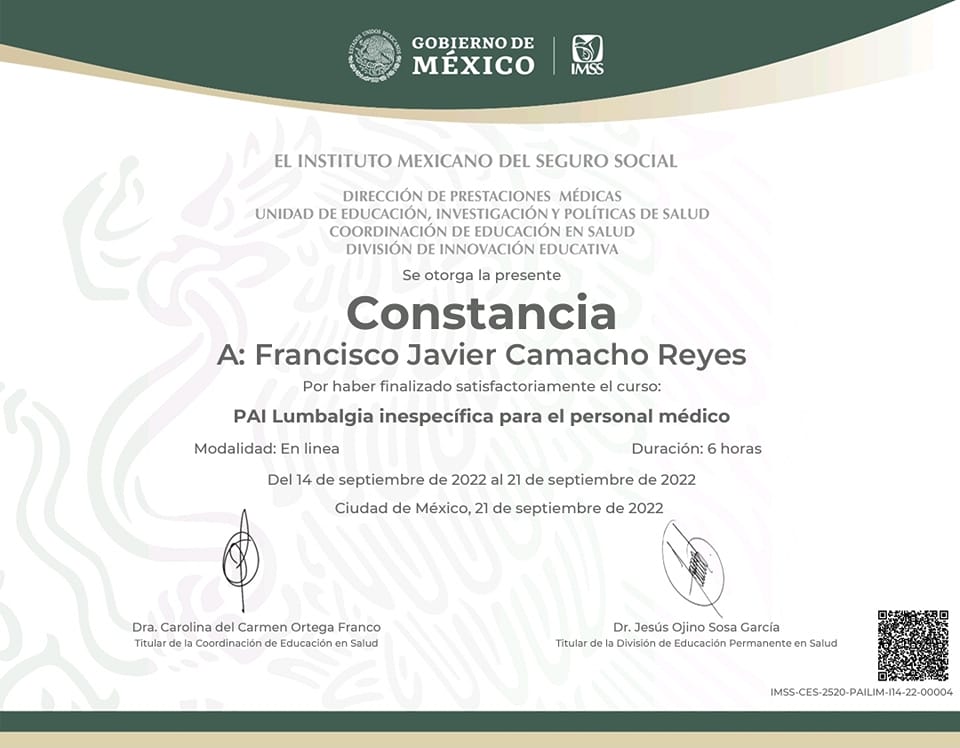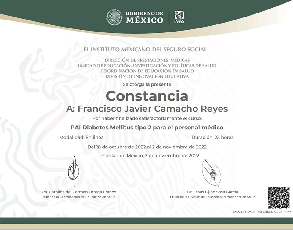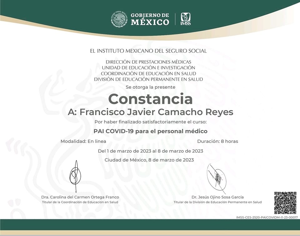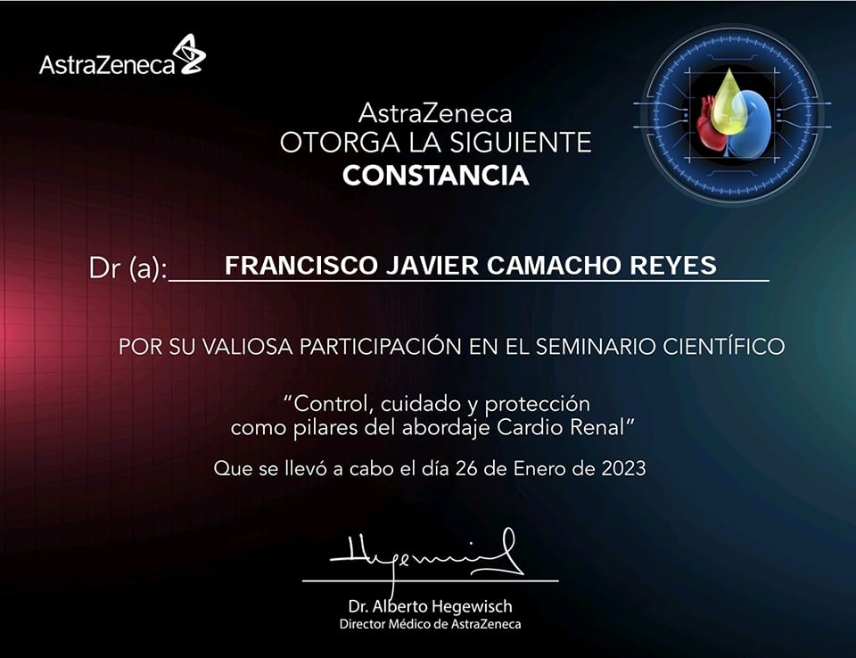 Soy el Dr. Francisco Javier Camacho Reyes, médico especialista en medicina familiar, con 20 años de experiencia. Mi misión siempre será coadyuvar al mantenimiento de la salud en personas sanas, con las medidas preventivas actuales y ayudar a aquellos pacientes que ya padecen alguna enfermedad a evitar su progresión y limitar el daño.